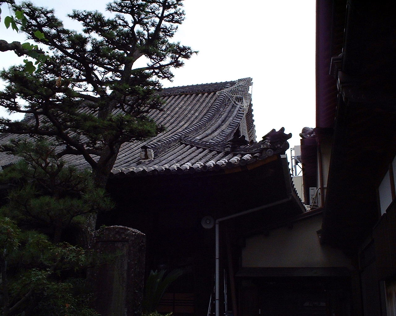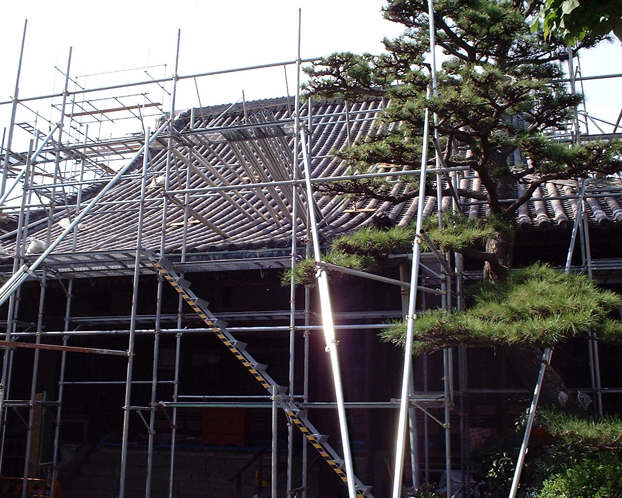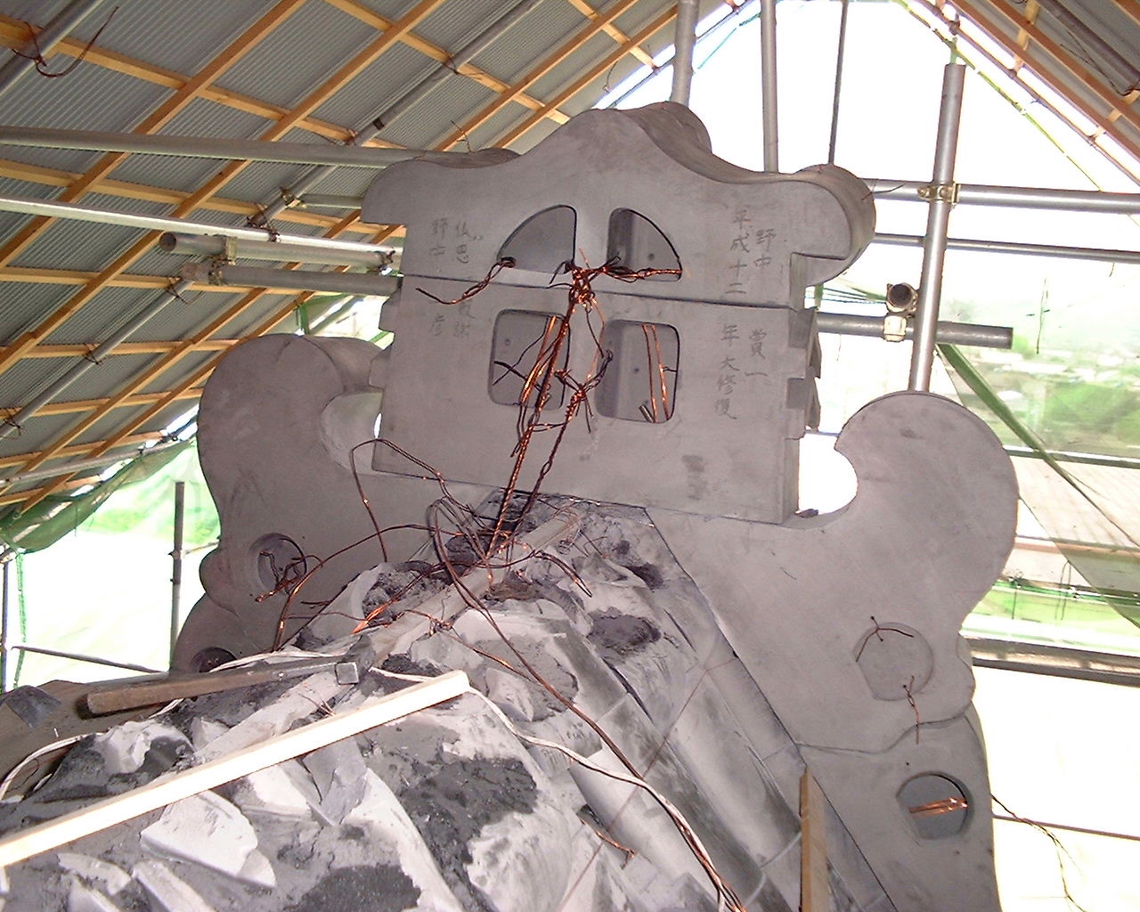 2000(平成十二)年、本堂屋根瓦を乾式(土無し)工法により葺き替える大規模な修復工事が完成。本堂修復工事写真 @ A B C D E F